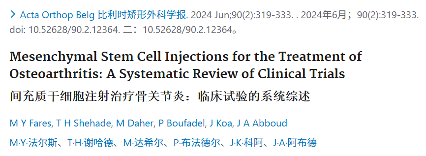 2. FARES M Y, SHEHADE T H, DAHER M, et al. Mesenchymal Stem Cell Injections for the Treatment of Osteoarthritis: A Systematic Review of Clinical Trials[J]. Acta Orthop Belg, 2024, 90(2): 319-333. https://doi.org/10.52628/90.2.12364. PMID: 39440509.