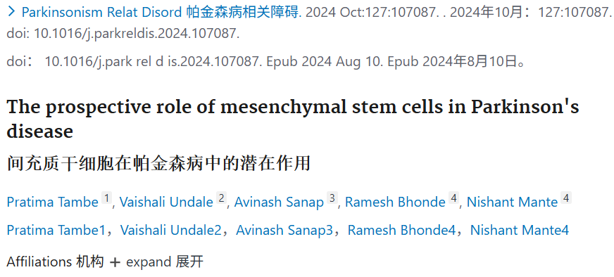 1. TAMBE P, UNDALE V, SANAP A, et al. The prospective role of mesenchymal stem cells in Parkinson's disease[J]. Parkinsonism & Related Disorders, 2024, Epub 2024 Aug 10. https://doi.org/10.1016/j.parkreldis.2024.107087. PMID: 39142905.