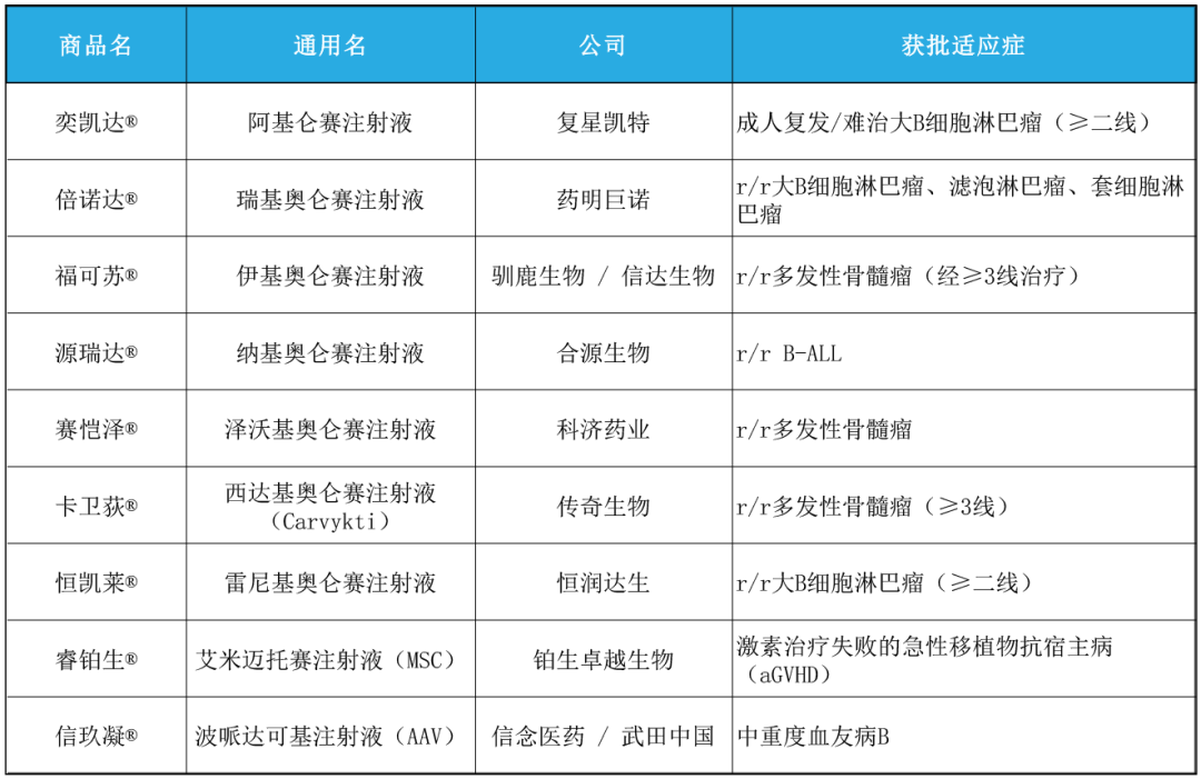 回顾过去四年,中国CGT从“首款产品获批”迅速迈入“产业加速期”。截至目前,已有9款CGT药物正式上市,涵盖CAR-T、干细胞和基因治疗三大核心技术,主要用于治疗血液肿瘤、移植相关并发症,以及部分遗传性罕见病。