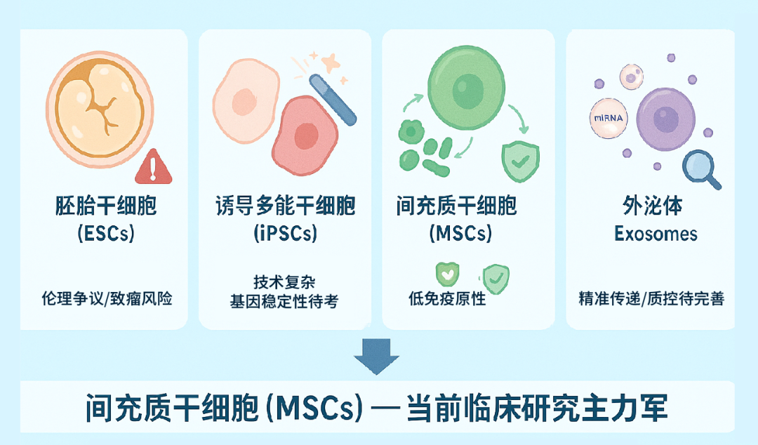 其中,间充质干细胞(MSCs)因其易获得、培养技术相对成熟、免疫相容性好,成为目前绝大部分临床研究的主流选择。