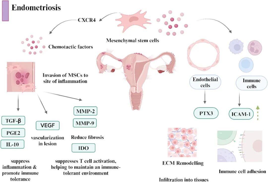 子宫内膜异位症影响约10%-15%的育龄女性。干细胞治疗可显著减轻炎症、减少异位病灶血管生成,缓解疾病症状。此外,针对薄型子宫内膜和宫腔粘连,研究发现使用脐带来源的间充质干细胞(UC-MSCs)联合胶原支架进行治疗后,患者妊娠率高达38%,疗效令人鼓舞。