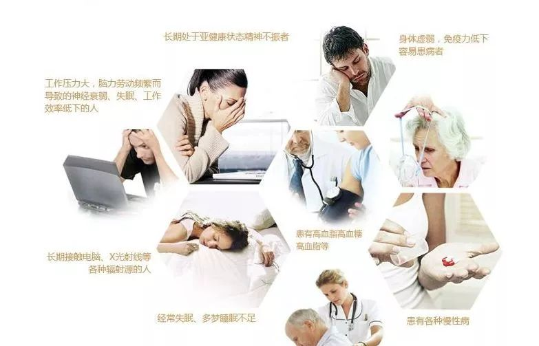 (3)机体未老先衰人群:机体衰老,缺乏活力,易疲倦,组织器官功能老化等;